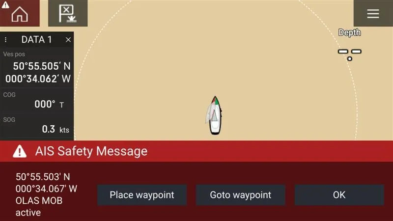 AIS Safety Broadcast (PGN 129802) – This internal alert simulates messages from EPIRB or SART devices with AIS VHF support, including the vessel's GPS location, allowing the chart plotter to mark the MOB point.
