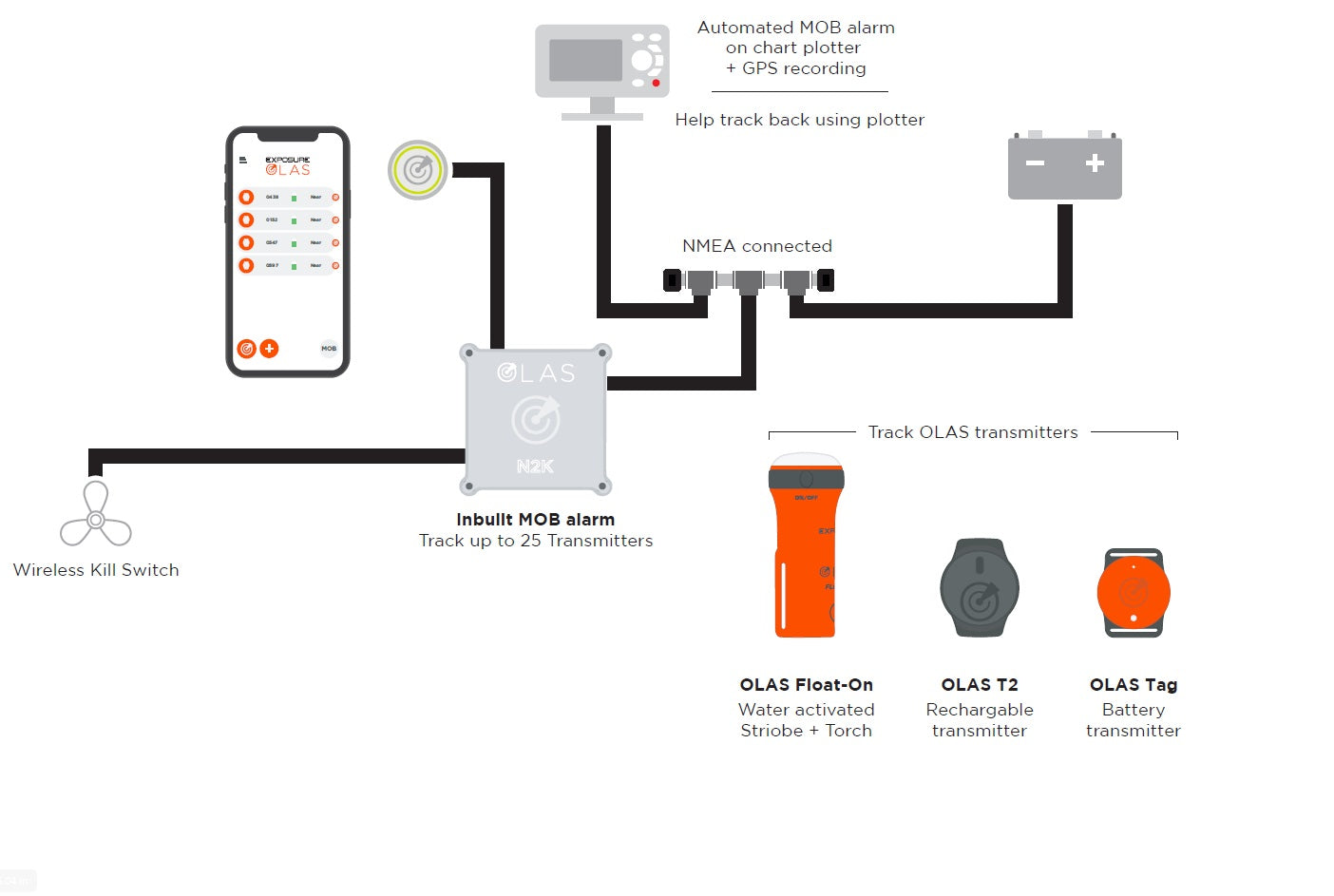 Enhance your boating experience and ensure the safety of yourself and your crew with the OLAS N2K. This remarkable device serves as a MOB alarm, a wireless engine kill switch, or both, providing you with a comprehensive safety system that gives you peace of mind on the water.